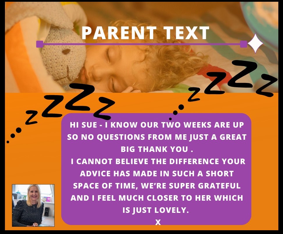 After three years of no sleep our son starting ,not only sleeping through the night but going to sleep on his own in his own bed! With small improvements seen from day one after speaking to Sue.