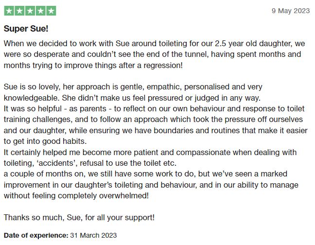 Sue has helped us make what seemed the impossible possible. Our son was really struggling with toileting and, at 8 years old, we were running out of options.
