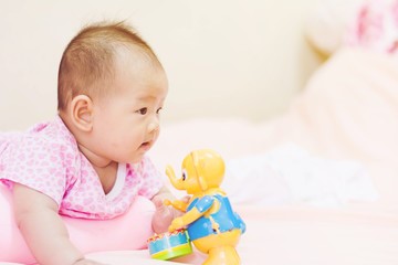 Attract baby's attention with noisy toys, try rolling toys in front of them to encourage eye movements