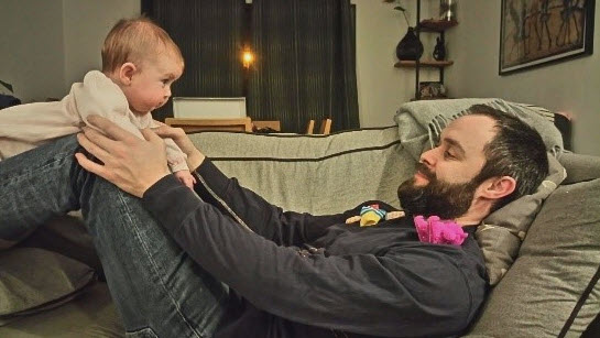 Lie down with baby face -to- face, push down on your hands against the floor as you lift your head. Babies love to watch and copy.